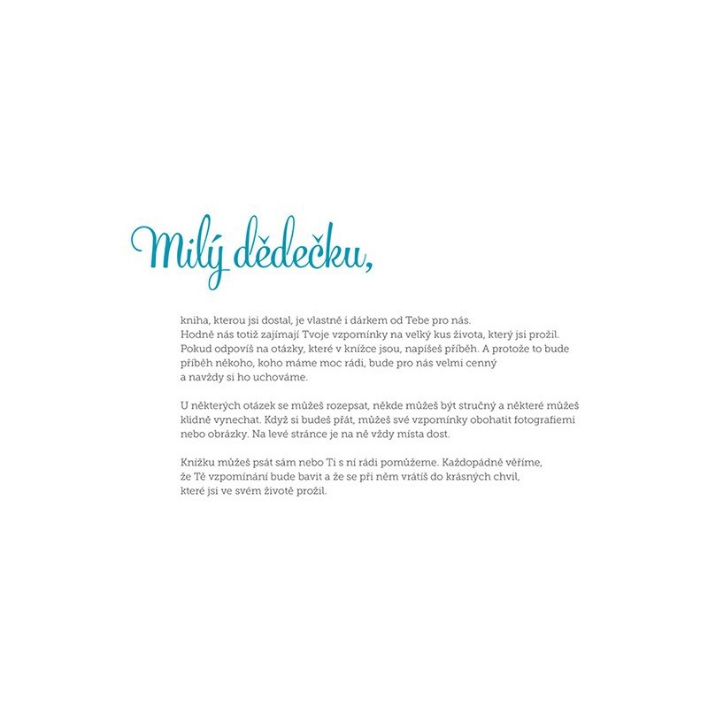 Pro dědečka bude jistě příjemné si zavzpomínat na historii, pro mladší generace a generace budoucí bude naopak zajímavé zjistit, jak se žilo a jak naši prarodiče vnímali i historické události během svého života.