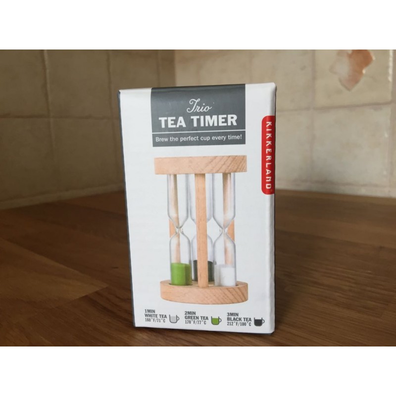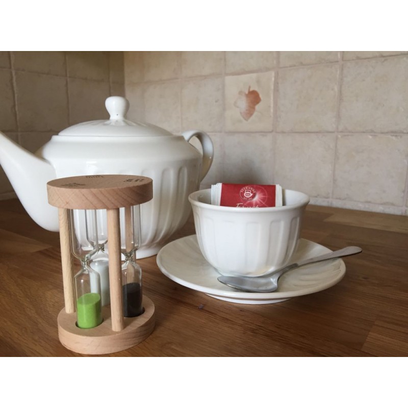 Přesýpací hodinky s barevně odlišeným pískem na přípravu zeleného, bílého a černého čaje. Na vrchním kolečku hodin je uvedený čas louhování i správná teplota vody na přípravu čajů.