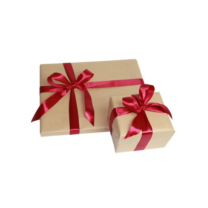 Hnědý kraftový papír (druh papíru s jemnými proužky) a saténová stuha barvy bordó, nebo modrá. Dárek vám zabalíme a ozdobíme mašlí.