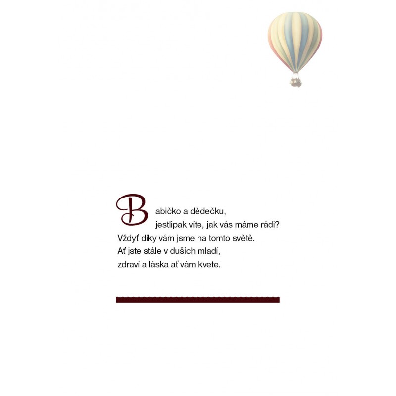 Dárkovým přáníčkem můžete poděkovat babičce a dědečkovi za jejich lásku, nebo pomoc v běžném životě. Popřát jim a potěšit je. Dodáme Vám je v krásném grafickém provedení, formátu A5 v obálce. Přání je otvítací a na pravé straně je vepsán text a drobná grafika.