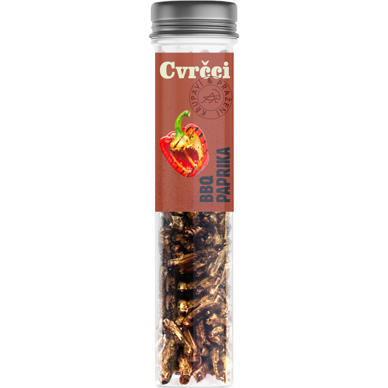 BBQ Paprika. Složení: cvrčci (Acheta domesticus) (87%), slunečnicový olej, bio paprika (3%), sůl mořská, bio paprika uzená (1%), bio cibule, bio česnek, bio zázvor, bio kukuřičná mouka, bio kvasnicový extrakt, bio pepř bílý mletý, bio římský kmín, bio chilli (0,1%).