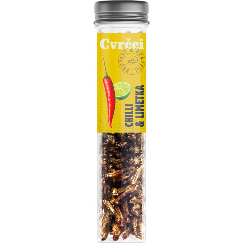 Limetka & Chilli. cvrčci (Acheta domesticus) (87%), slunečnicový olej, cukr, sůl, chilli (1,2%), limetka (1%), kvasnicový extrakt, paprika, aroma, regulátor kyselosti (E330).