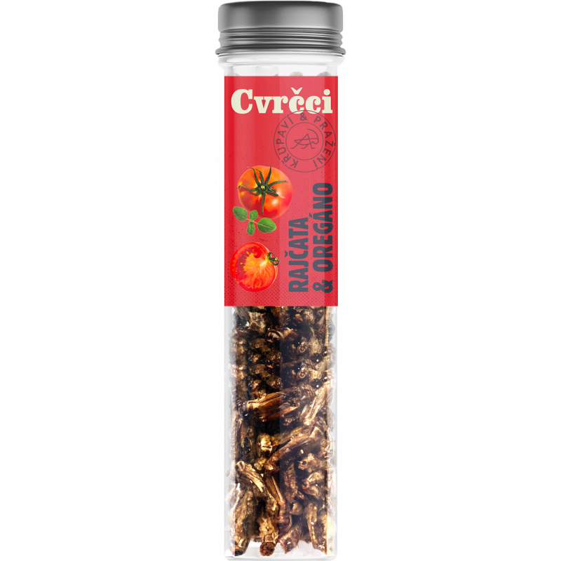 Rajče & Oregáno. Složení: cvrčci (Acheta domesticus) (87%), slunečnicový olej, cukr, sůl, cibule, rajčatový prášek (1%), paprika, kvasnicový extrakt, maltodextrin, česnek, oregáno (0,2%), regulátor kyselosti (E330), aroma.