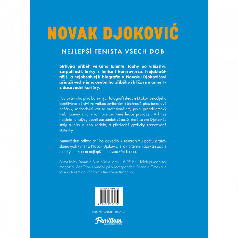 Tato fascinující biografie odhaluje příběh Novaka Djokoviće – od jeho talentu a touhy po vítězství až po lásku k tenisu a kontroverze, které kariéru tohoto hráče provázejí. Sleduje jeho cestu od dětství v Bělehradě, přes profesionální začátky, první grandslamový titul, až po rodinný život. Kniha obsahuje analýzy klíčových zápasů a statistiky, které mapují jeho výjimečnou kariéru,