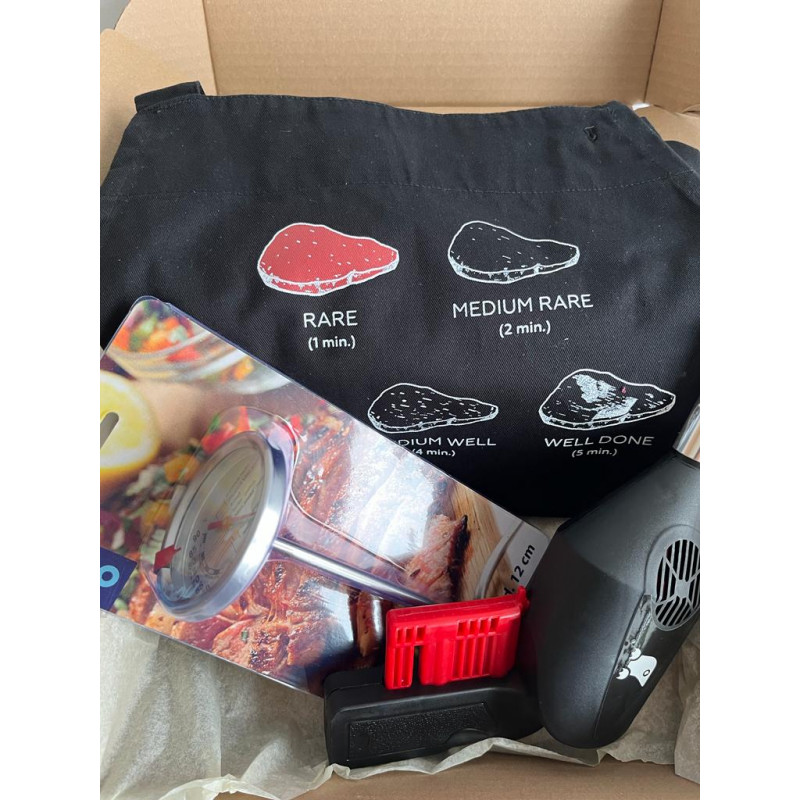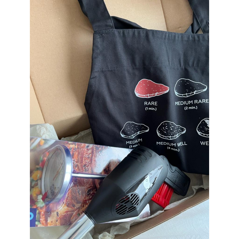 V dárkovém balení najdete originální zástěru s malou nápovědou, jak připravit vynikající steak, ruční rozdmýchávač ohně a hlavně teploměr na maso, který ukáže, jak moc je váš steak propečený.