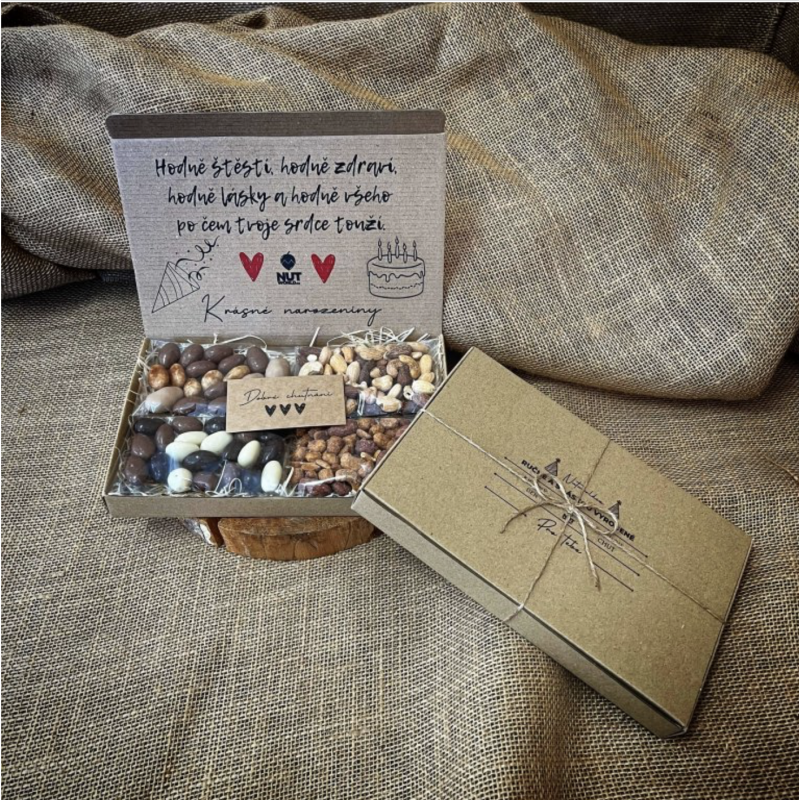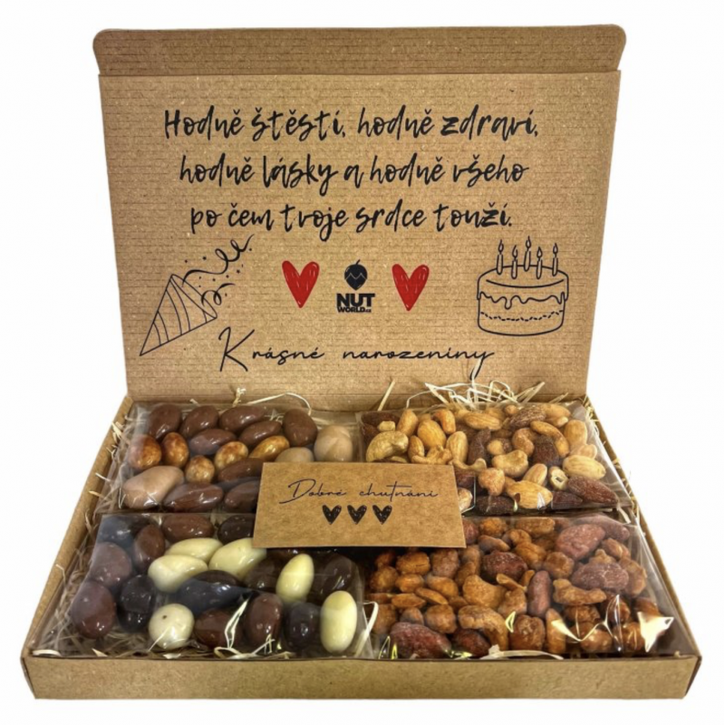 Přemýšlíte, čím udělat radost babičce nebo dědečkovi k narozeninám? Máme pro vás jedinečný tip. Tato dárková sada s narozeninovým blahopřáním obsahuje vynikající směs sladkých i slaných ořechů ve čtyřech různých variantách.