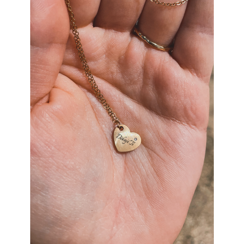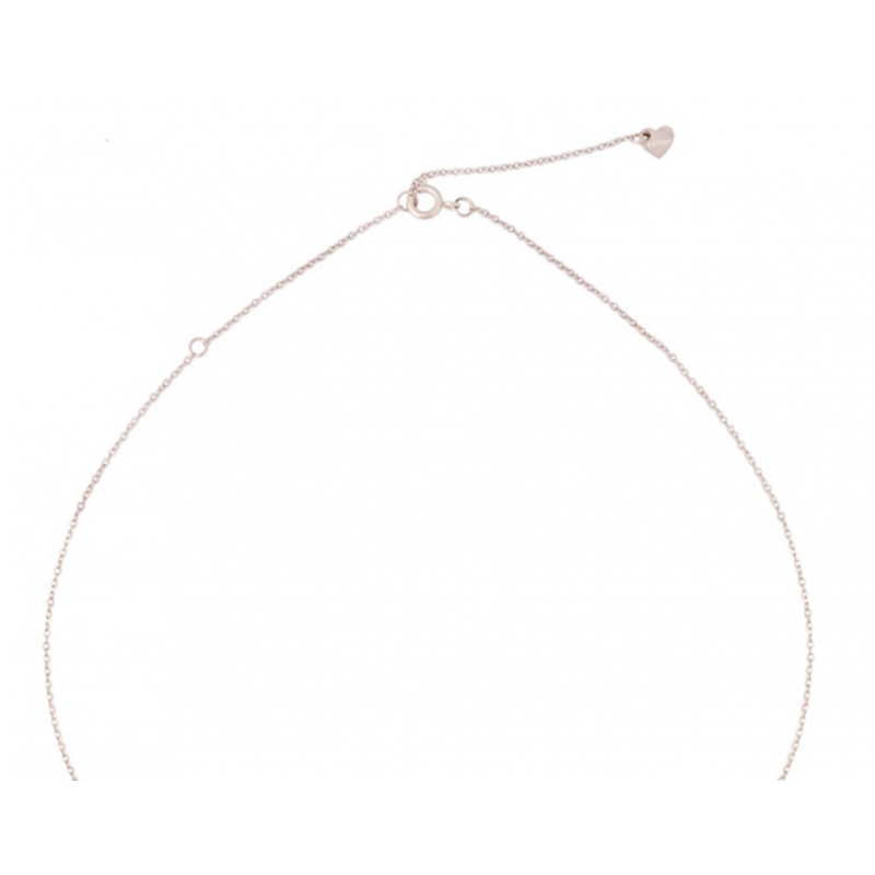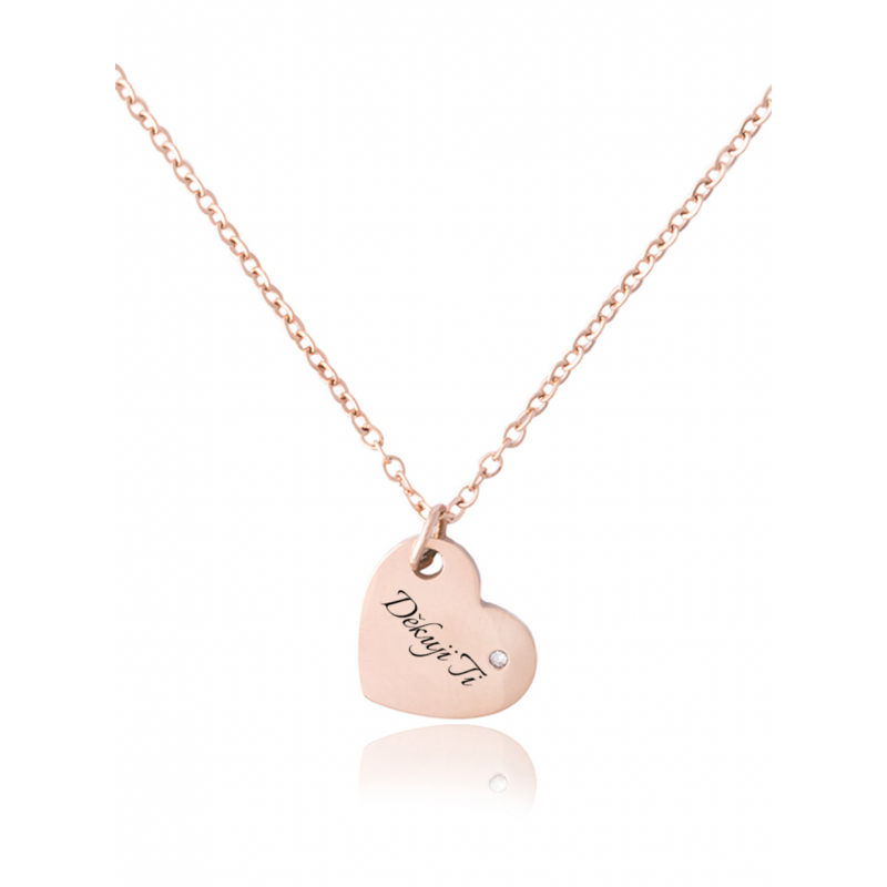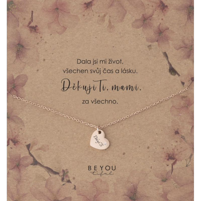 Řetízek se srdíčkem, kterému dominuje zirkon a text „Děkuji Ti“ je vyrobený z chirurgické oceli, je pozlacený růžovým zlatem a hodí se na dlouhodobé nošení.