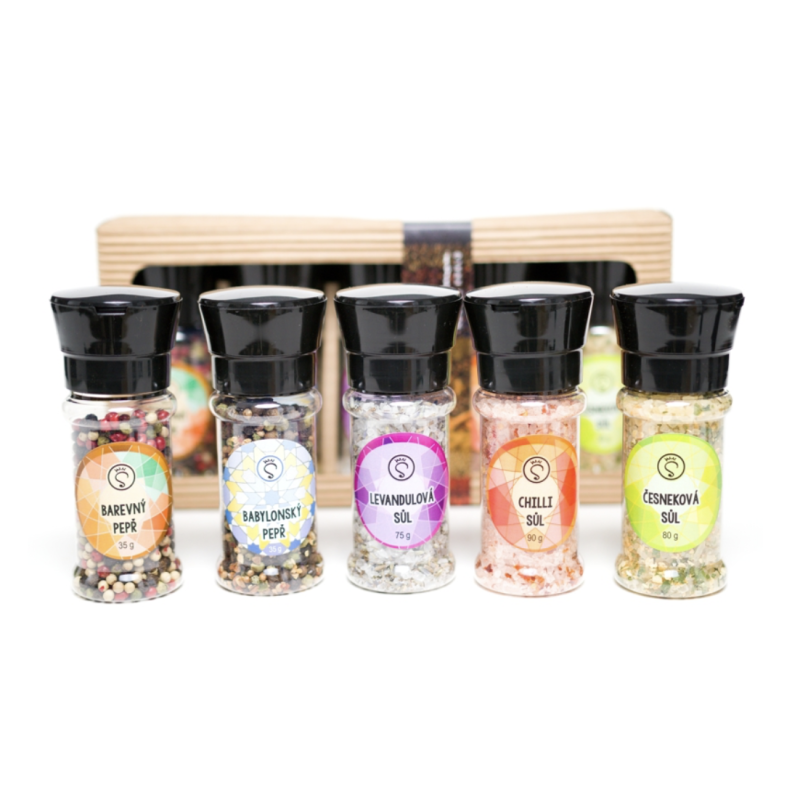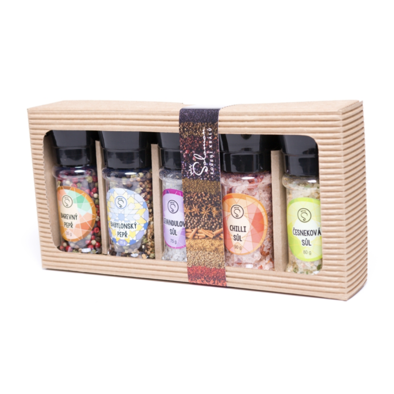 Dárková sada s pěti mlýnky. Sada obsahuje dva druhy pepřů a tři druhy solí. Mlýnky lze opakovaně doplňovat nebo měnit náplň.