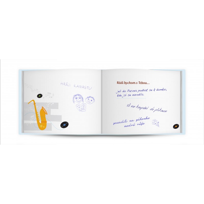 Do knížky lze přidat rodinné fotografie, děti mohou namalovat obrázky na přední a zadní volnou stránku nebo kamkoliv dovnitř knížky. Vaše vřelá slova budou mít tu největší sílu.