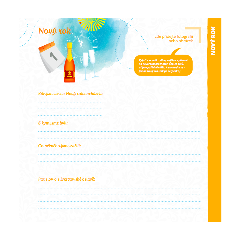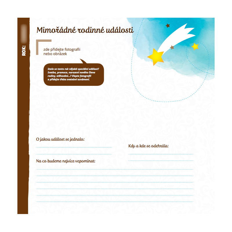 Super nápad vytvořit nějakou takovouhle knížku. Jsou tam stránky pro každoroční události i pro události nové. Když už ji člověk má, tak mu to nedá, aby aspoň něco nezapsal. A později aspoň budeme mít čím listovat.