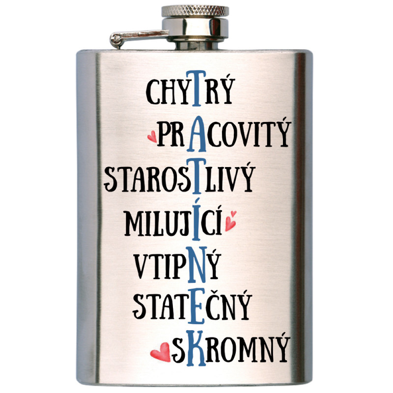 Co zahřeje u srdíčka víc než uleželá slivovice? No přece důkaz naší lásky! Spojte příjemné s užitečným a věnujte tatínkovi dárek k narozeninám v podobě placatky s nápisy, které dohromady tvoří slovo tatínek. Kdykoliv si pak lokne, vzpomene si na vás!