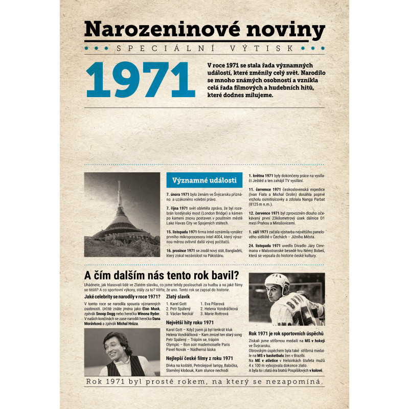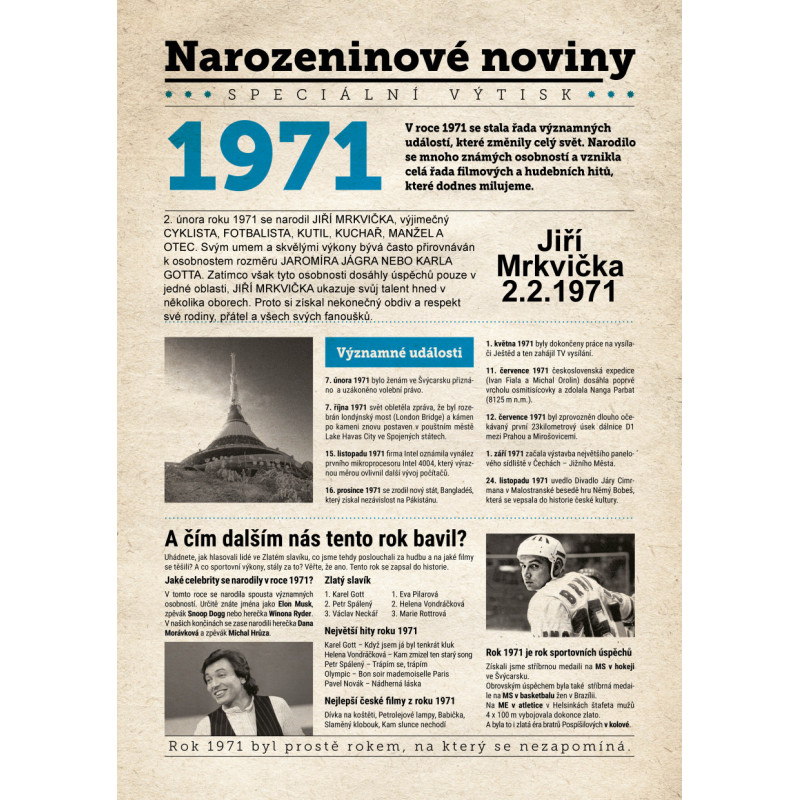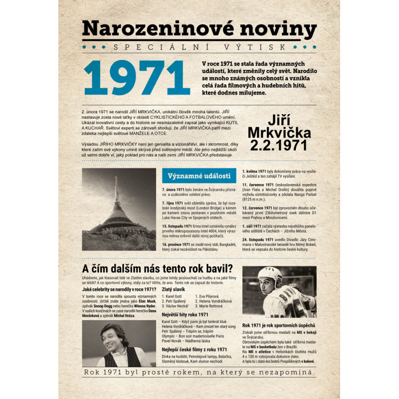 Udělejte radost svému oslavenci jedinečným dárkem - speciálním výtiskem novin s narozeninovou zprávou jen a jen o něm. Co všechno v novinách najde? Kromě zajímavostí z roku 1971 zjistí, kdo další se v tomto roce narodil, jaké události se zapsaly do historie a jaká hudba se zrovna poslouchala.