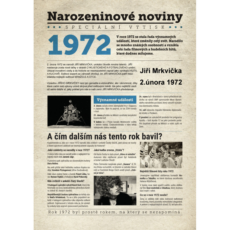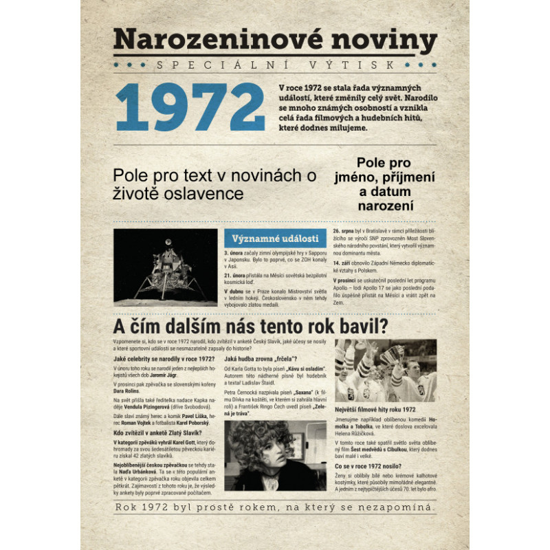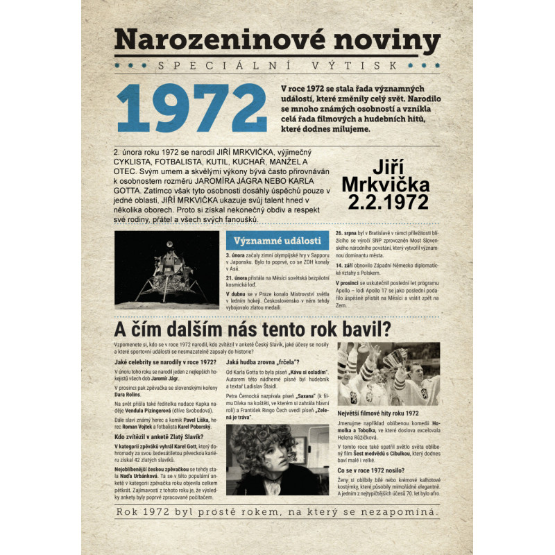 Udělejte radost svému oslavenci jedinečným dárkem - speciálním výtiskem novin s narozeninovým přáním jen a jen pro něj. Co všechno v novinách najde? Kromě zajímavostí z roku 1972 zjistí, kdo další se v tomto roce narodil, jaké události se zapsaly do historie a jaká hudba se zrovna poslouchala.