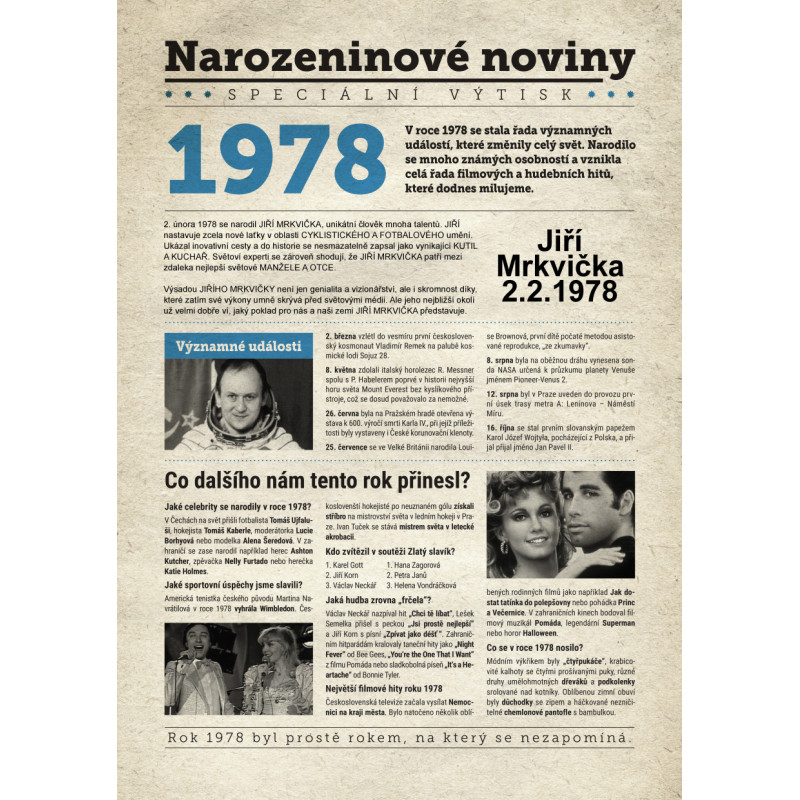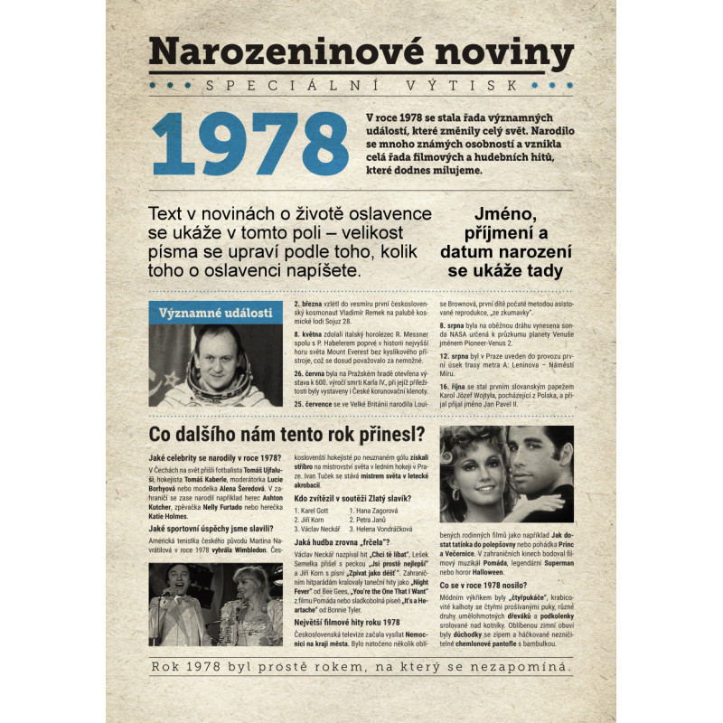 Udělejte radost svému oslavenci jedinečným dárkem - speciálním výtiskem novin s narozeninovou zprávou jen a jen o něm. Co všechno v novinách najde? Kromě zajímavostí z roku 1978 zjistí, kdo další se v tomto roce narodil, jaké události se zapsaly do historie a jaká hudba se zrovna poslouchala.