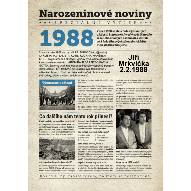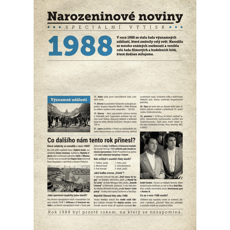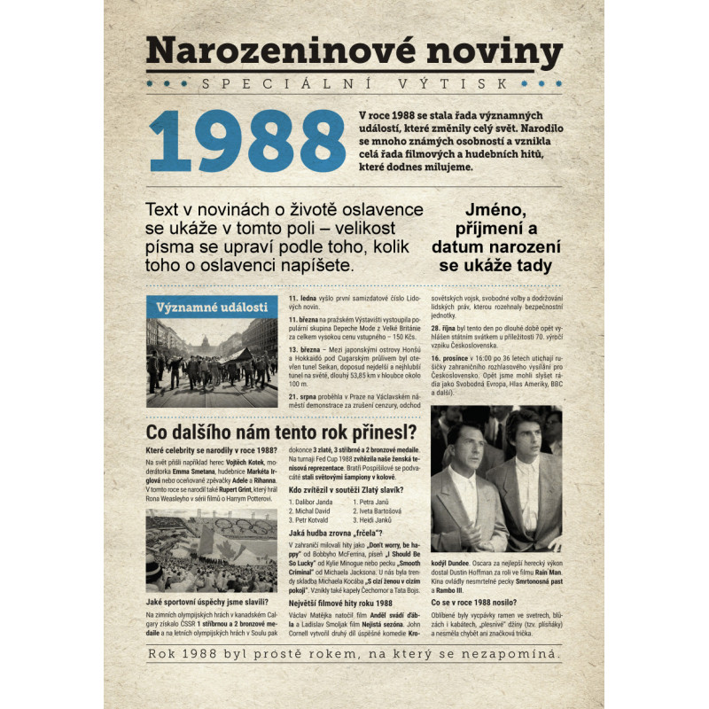 Udělejte radost svému oslavenci jedinečným dárkem - speciálním výtiskem novin s narozeninovou zprávou jen a jen o něm. Co všechno v novinách najde? Kromě zajímavostí z roku 1988 zjistí, kdo další se v tomto roce narodil, jaké události se zapsaly do historie a jaká hudba se zrovna poslouchala.