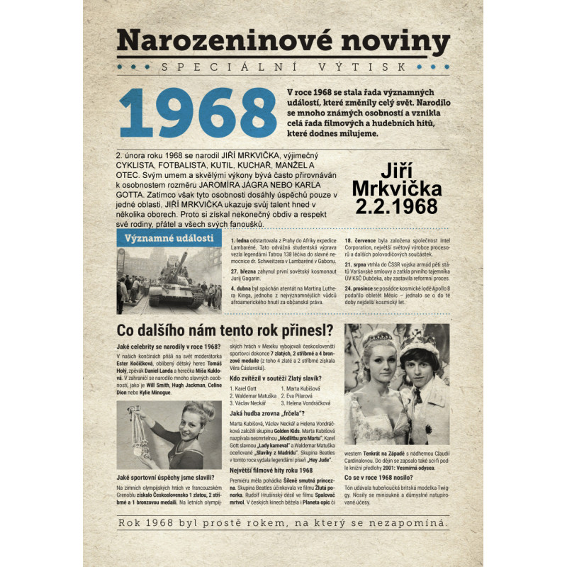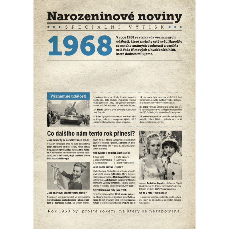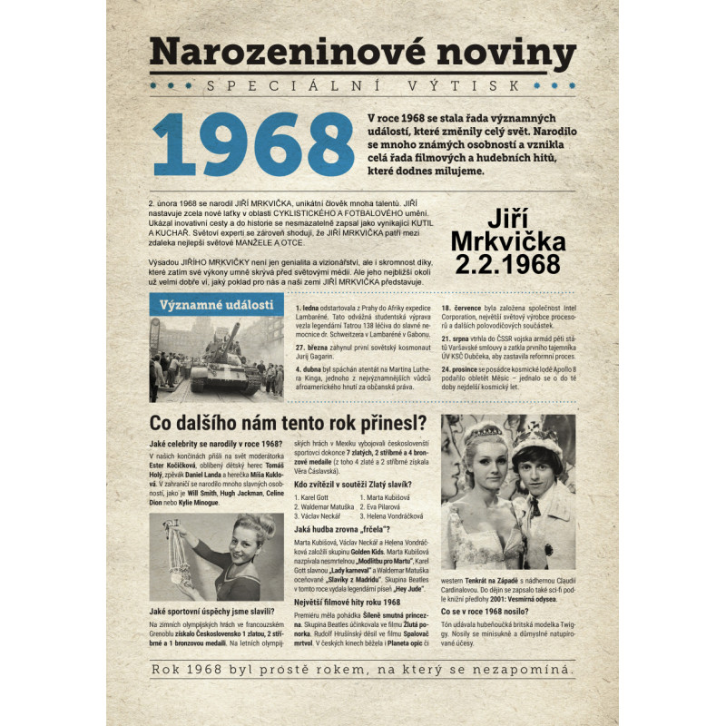 Udělejte radost svému oslavenci jedinečným dárkem - speciálním výtiskem novin s narozeninovou zprávou jen a jen o něm. Co všechno v novinách najde? Kromě zajímavostí z roku 1968 zjistí, kdo další se v tomto roce narodil, jaké události se zapsaly do historie a jaká hudba se zrovna poslouchala.