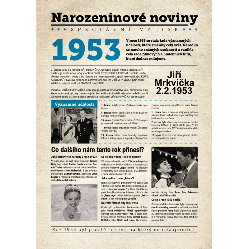 Udělejte radost svému oslavenci jedinečným dárkem - speciálním výtiskem novin s narozeninovou zprávou jen a jen o něm. Co všechno v novinách najde? Kromě zajímavostí z roku 1953 zjistí, kdo další se v tomto roce narodil, jaké události se zapsaly do historie a jaká hudba se zrovna poslouchala.
