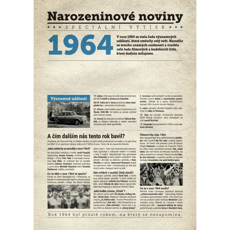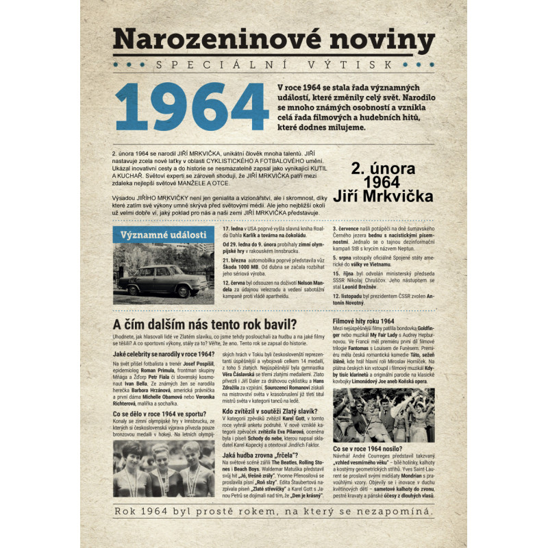 Udělejte radost svému oslavenci jedinečným dárkem - speciálním výtiskem novin s narozeninovou zprávou jen a jen o něm. Co všechno v novinách najde? Kromě zajímavostí z roku 1964 zjistí, kdo další se v tomto roce narodil, jaké události se zapsaly do historie a jaká hudba se zrovna poslouchala.