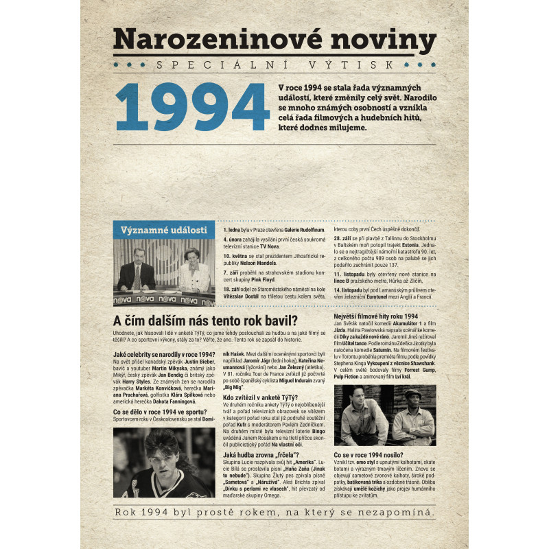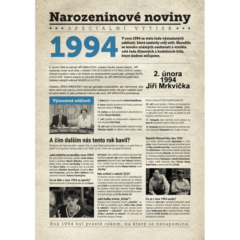 Udělejte radost svému oslavenci jedinečným dárkem - speciálním výtiskem novin s narozeninovou zprávou jen a jen o něm. Co všechno v novinách najde? Kromě zajímavostí z roku 1994 zjistí, kdo další se v tomto roce narodil, jaké události se zapsaly do historie a jaká hudba se zrovna poslouchala.