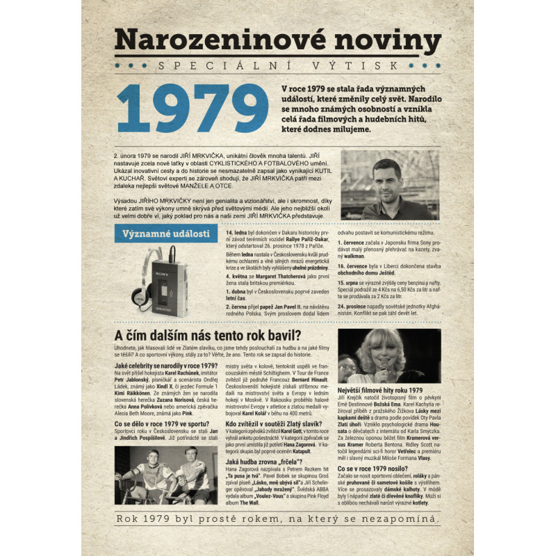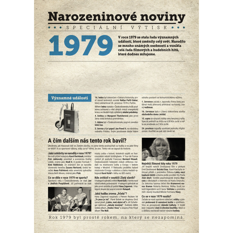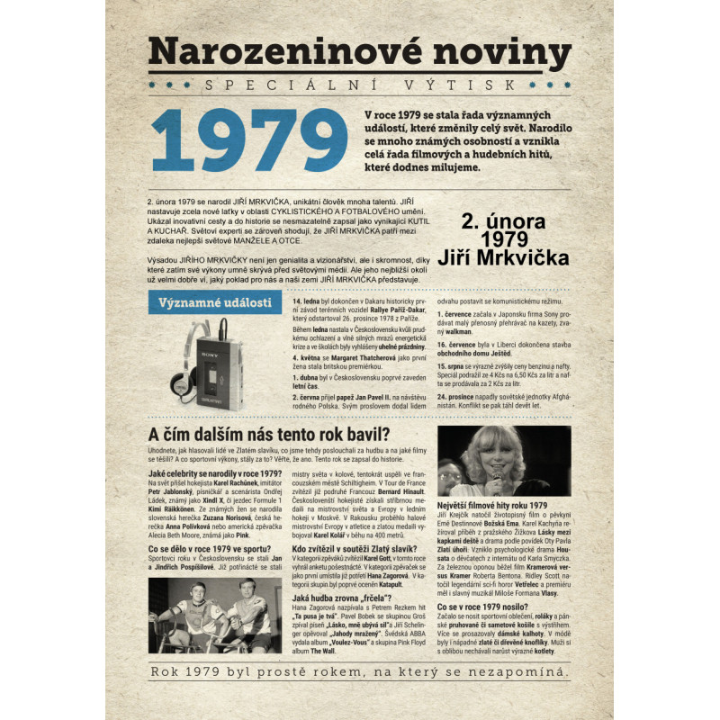 Udělejte radost svému oslavenci jedinečným dárkem - speciálním výtiskem novin s narozeninovou zprávou jen a jen o něm. Co všechno v novinách najde? Kromě zajímavostí z roku 1979 zjistí, kdo další se v tomto roce narodil, jaké události se zapsaly do historie a jaká hudba se zrovna poslouchala.