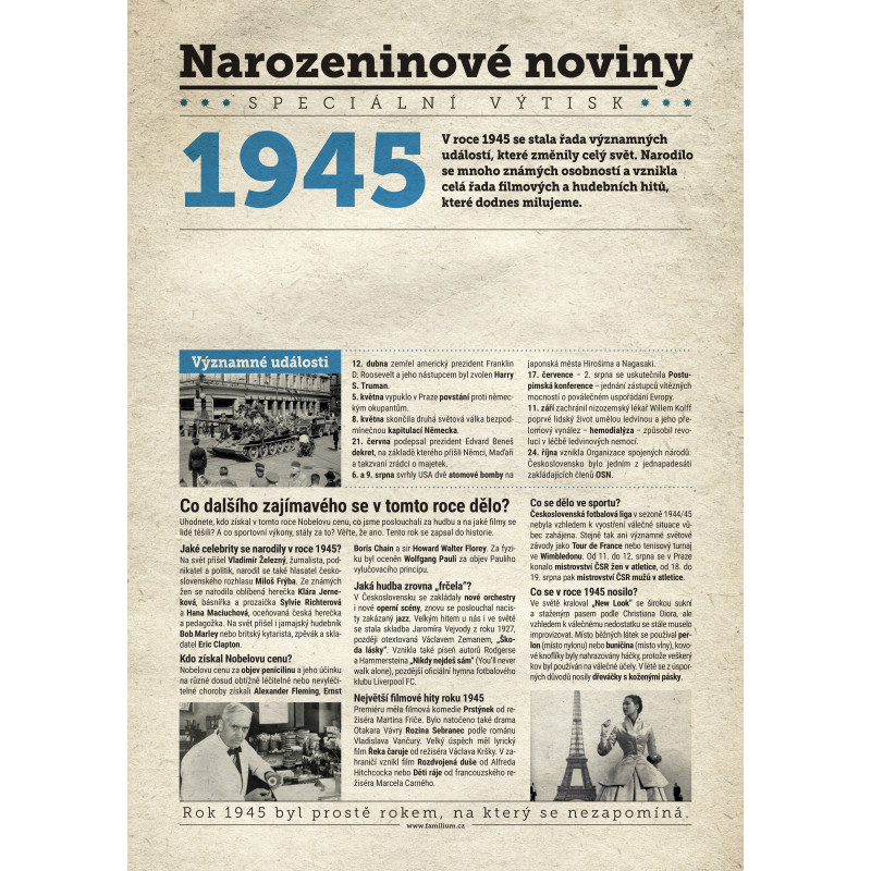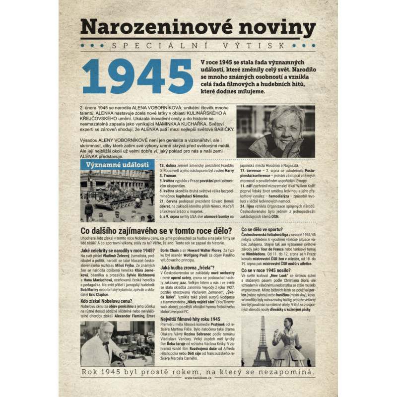 Udělejte radost svému oslavenci jedinečným dárkem - speciálním výtiskem novin s narozeninovou zprávou jen a jen o něm. Co všechno v novinách najde? Kromě zajímavostí z roku 1945 zjistí, kdo další se v tomto roce narodil, jaké události se zapsaly do historie a jaká hudba se zrovna poslouchala.