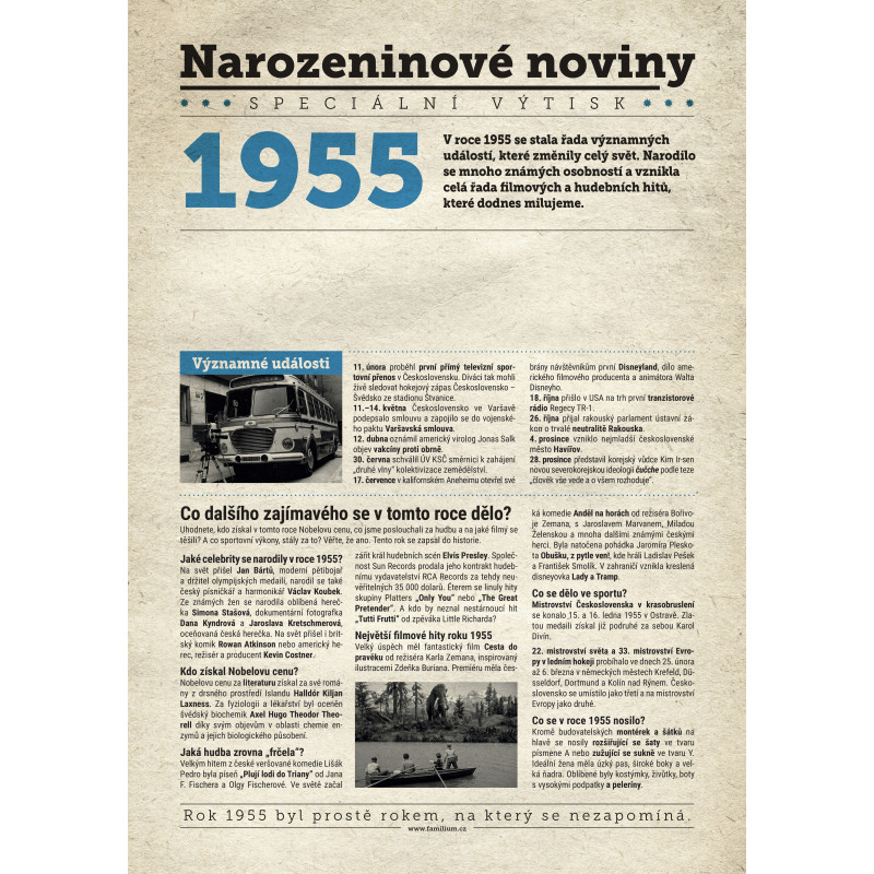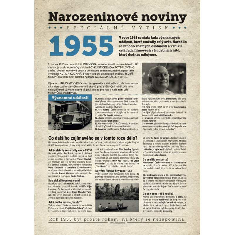 Udělejte radost svému oslavenci jedinečným dárkem - speciálním výtiskem novin s narozeninovou zprávou jen a jen o něm. Co všechno v novinách najde? Kromě zajímavostí z roku 1955 zjistí, kdo další se v tomto roce narodil, jaké události se zapsaly do historie a jaká hudba se zrovna poslouchala.