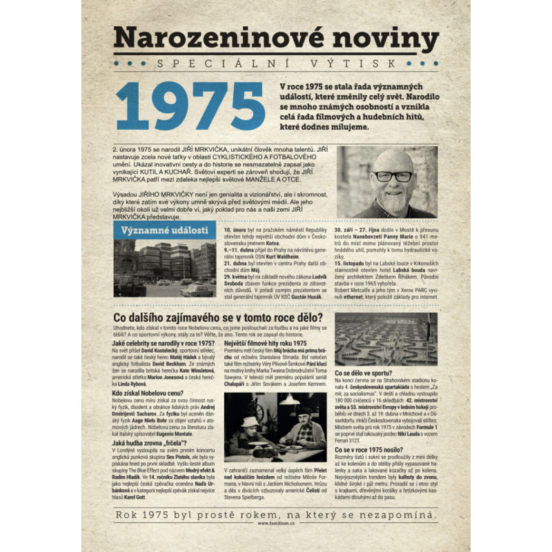 Udělejte radost svému oslavenci jedinečným dárkem - speciálním výtiskem novin s narozeninovou zprávou jen a jen o něm. Co všechno v novinách najde? Kromě zajímavostí z roku 1975 zjistí, kdo další se v tomto roce narodil, jaké události se zapsaly do historie a jaká hudba se zrovna poslouchala.