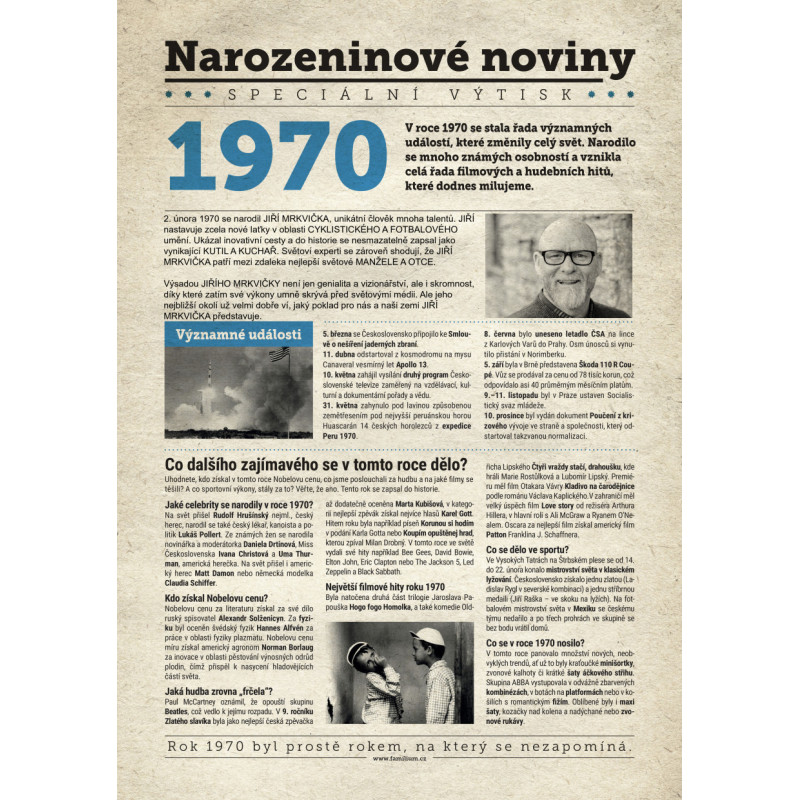 Udělejte radost svému oslavenci jedinečným dárkem - speciálním výtiskem novin s narozeninovou zprávou jen a jen o něm. Co všechno v novinách najde? Kromě zajímavostí z roku 1970 zjistí, kdo další se v tomto roce narodil, jaké události se zapsaly do historie a jaká hudba se zrovna poslouchala.
