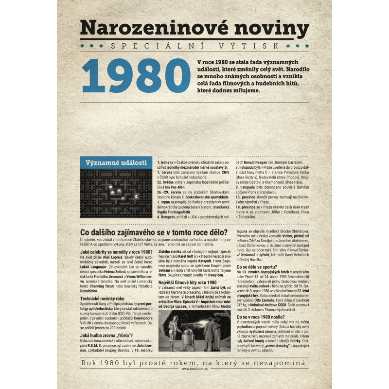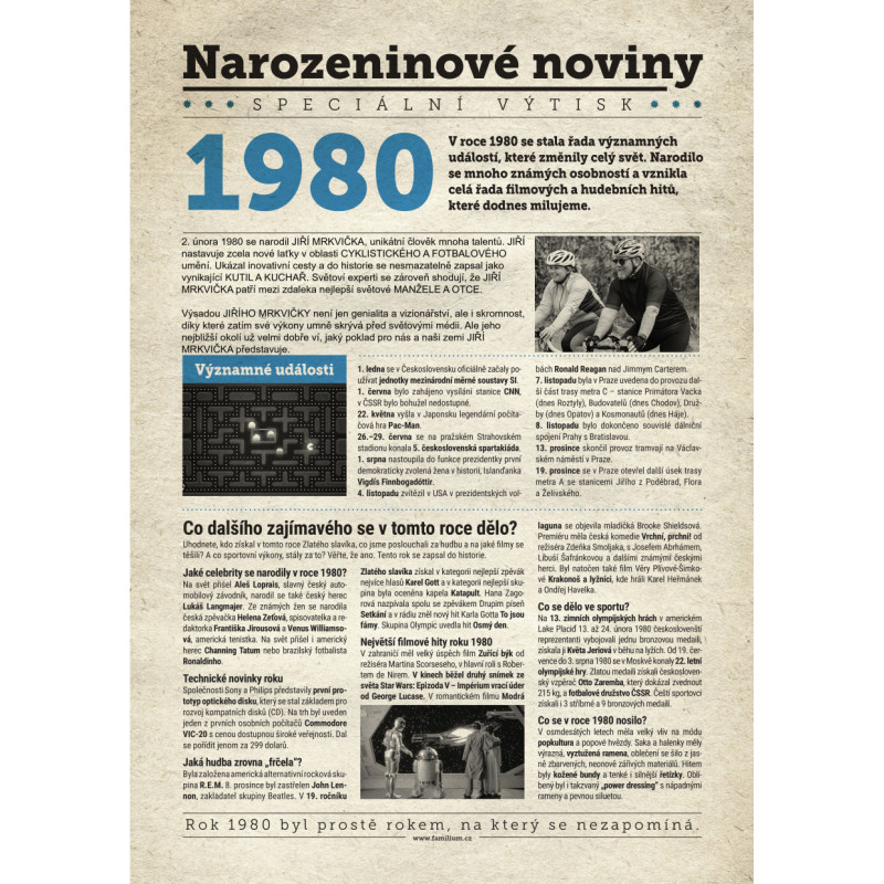 Udělejte radost svému oslavenci jedinečným dárkem - speciálním výtiskem novin s narozeninovou zprávou jen a jen o něm. Co všechno v novinách najde? Kromě zajímavostí z roku 1980 zjistí, kdo další se v tomto roce narodil, jaké události se zapsaly do historie a jaká hudba se zrovna poslouchala.