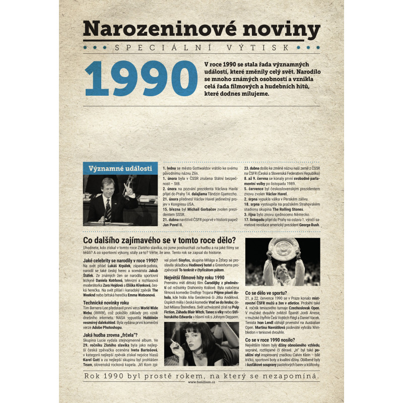 Udělejte radost svému oslavenci jedinečným dárkem - speciálním výtiskem novin s narozeninovou zprávou jen a jen o něm. Co všechno v novinách najde? Kromě zajímavostí z roku 1990 zjistí, kdo další se v tomto roce narodil,  jaké události se zapsaly do historie a jaká hudba se zrovna poslouchala.