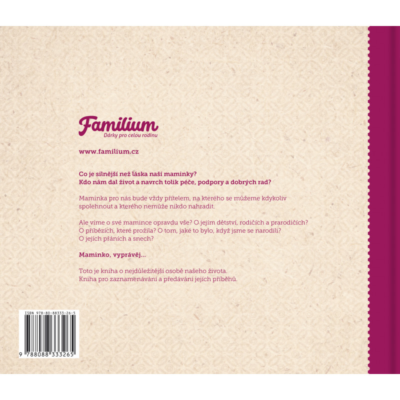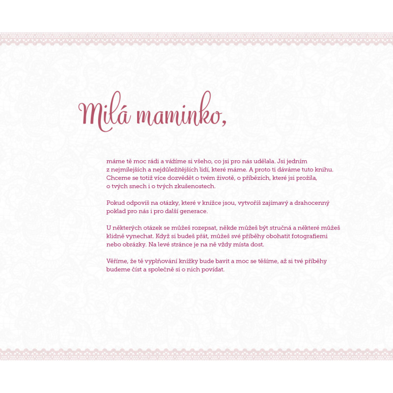 Představujeme vám jedinečný dárek pro vaši maminku – knihu „Maminko, vyprávěj“. Tato vyplňovací kniha je navržena tak, aby maminka mohla zaznamenat nejkrásnější příběhy ze svého života. Obsahuje pečlivě vybrané otázky, které ji provedou vzpomínkami na dětství, rodiče a prarodiče, školní léta i okamžiky, kdy se stala maminkou.