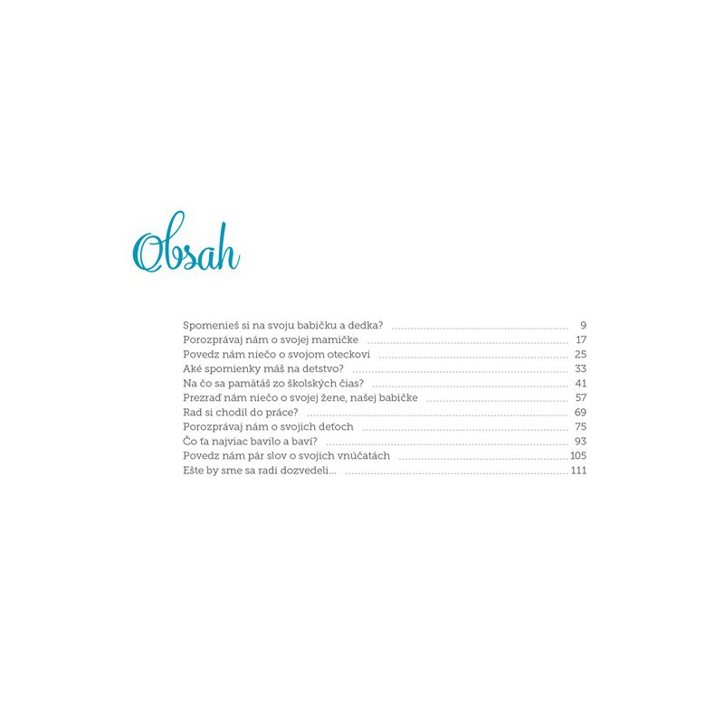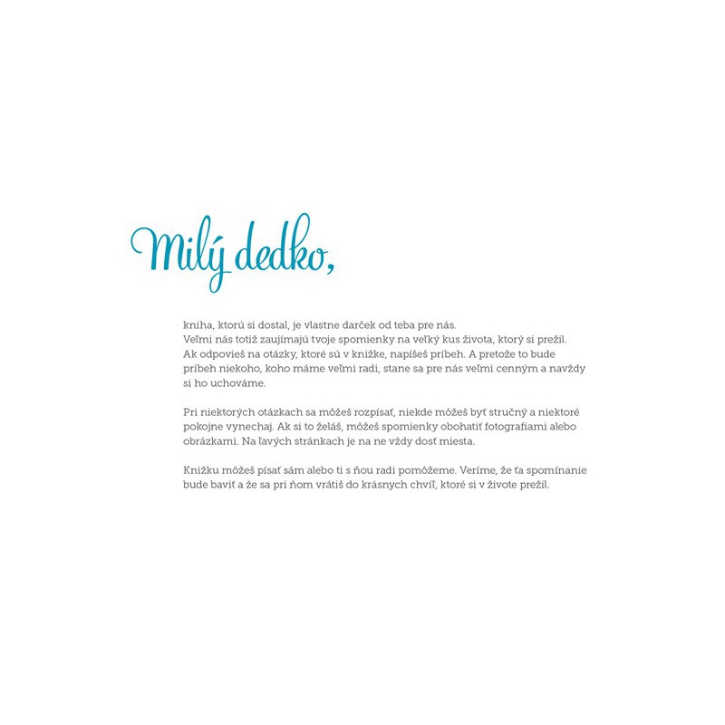 Otvorená kniha na zaznamenávanie spomienok vášho dedka od detstva po súčasnosť. Dedko bude môcť sám alebo s vašou pomocou vypĺňať knižku a odpovie tak celý rad starostlivo vybraných otázok. Napríklad: čím chcel byť, keď bol malý; akí boli jeho rodičia a prarodičia; kde sa hrával; kedy stretol babičku – svoju ženu; čo spolu zažili; ako dedko vnímal historické udalosti; čo sa podľa neho zmenilo od čias jeho mladosti...