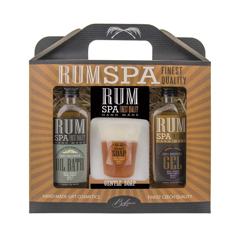 Dárkové balení kosmetiky s rumovým aroma Rum Spa. Rumový sprchový gel 100 ml, ručně vyráběné tvarované mýdlo 70 g a olejová lázeň 100 ml. Kosmetická sada pro muže i dámy s vůní rumu.