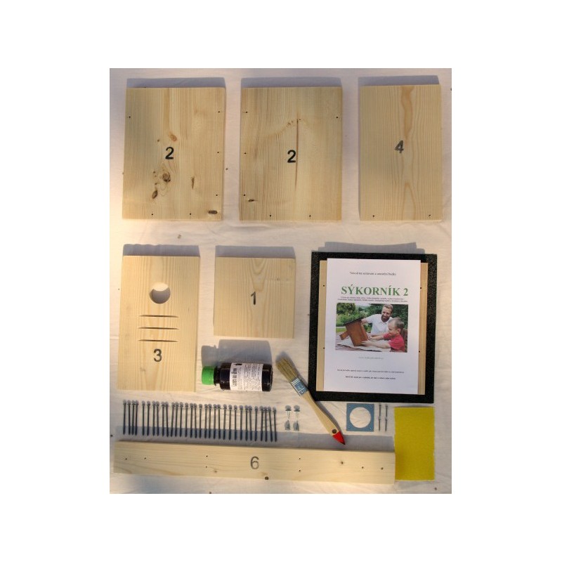 Balíček obsahuje: jednotlivé díly budky, 3 druhy hřebíků, lepenka na střechu, ochrana vletového otvoru z pozinkovaného plechu, štětec, 100ml impregnace na dřevo a podrobný návod jak budku správně sestavit a natřít, jak a kam ji pověsit nebo co a kdy později kontrolovat. Stavebnice je pro přepravu zabalená v jutovém pytli, který se dá dále využít.