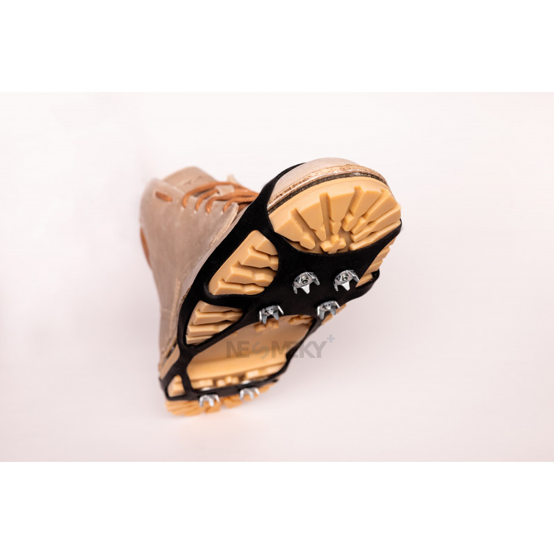 Nesmeky plus navlékneme na obuv tak, že je položíme hroty na zem a přišlápneme. Poté přední část (se 4 hroty) důkladně přetáhneme přes špici boty a zadní část (se 2 hroty) přes patu obuvi. Materiál je velmi pružný, k přetržení nedojde.