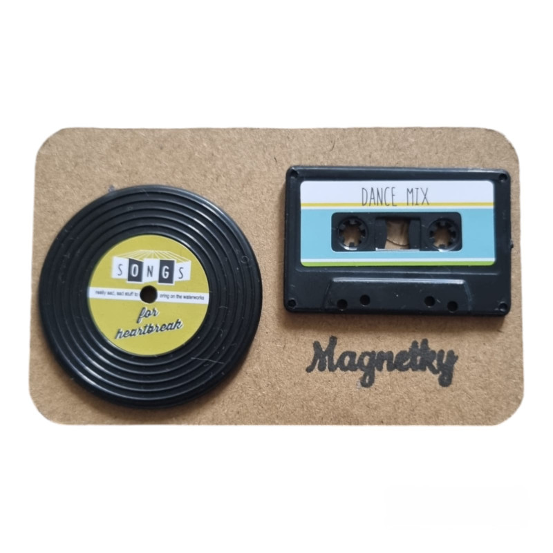 Magnetky: 1x LP, 1x audio kazeta na kraftovém papíru, rozměry kazety 4,2 x 3cm, LP desky 4,2 x 4,2 cm, materiál plast ABS