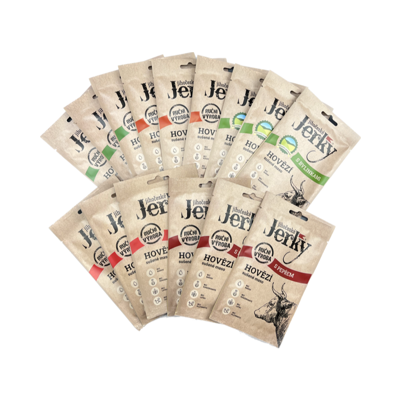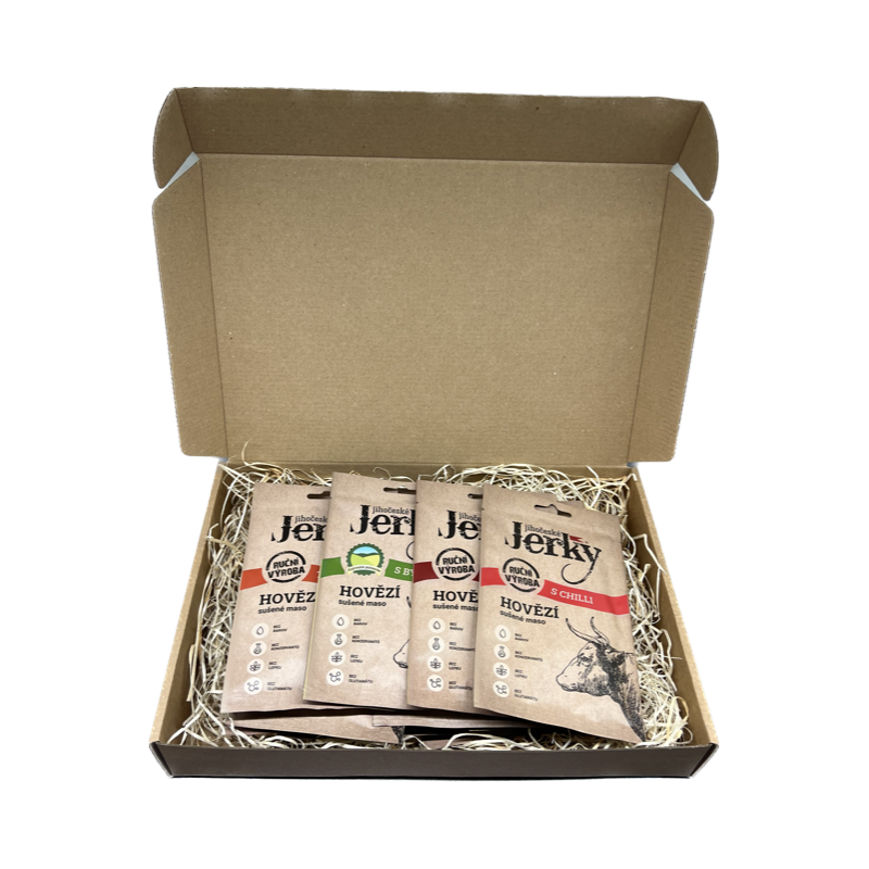 Maso je cenným zdrojem bílkovin, železa, zinku a mnoha dalších důležitých látek, které naše tělo potřebuje. Proč nevyzkoušet maso také v sušené podobě, když chutná tak skvěle? Přinášíme dárkové balení vynikajícího sušeného hovězího masa v několika příchutích. Na své si přijdou i milovníci ostřejších chutí, protože hovězí s chilli chutná vskutku jedinečně. Tímto degustačním balíčkem můžete obdarovat své blízké a společně si pochutnat na výborném a kvalitním mase od Jihočeské Jerky.