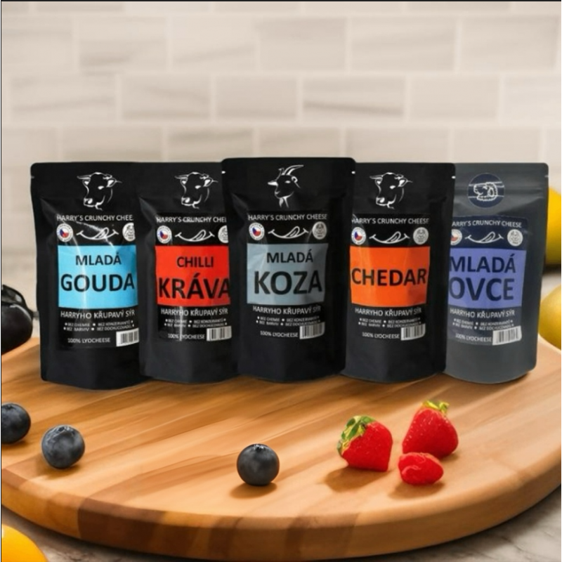 Dárková sada obsahuje 5 x 15 g sýrů sušených mrazem: