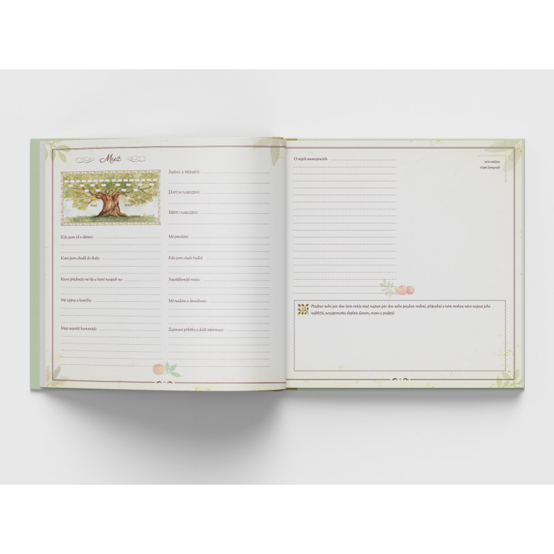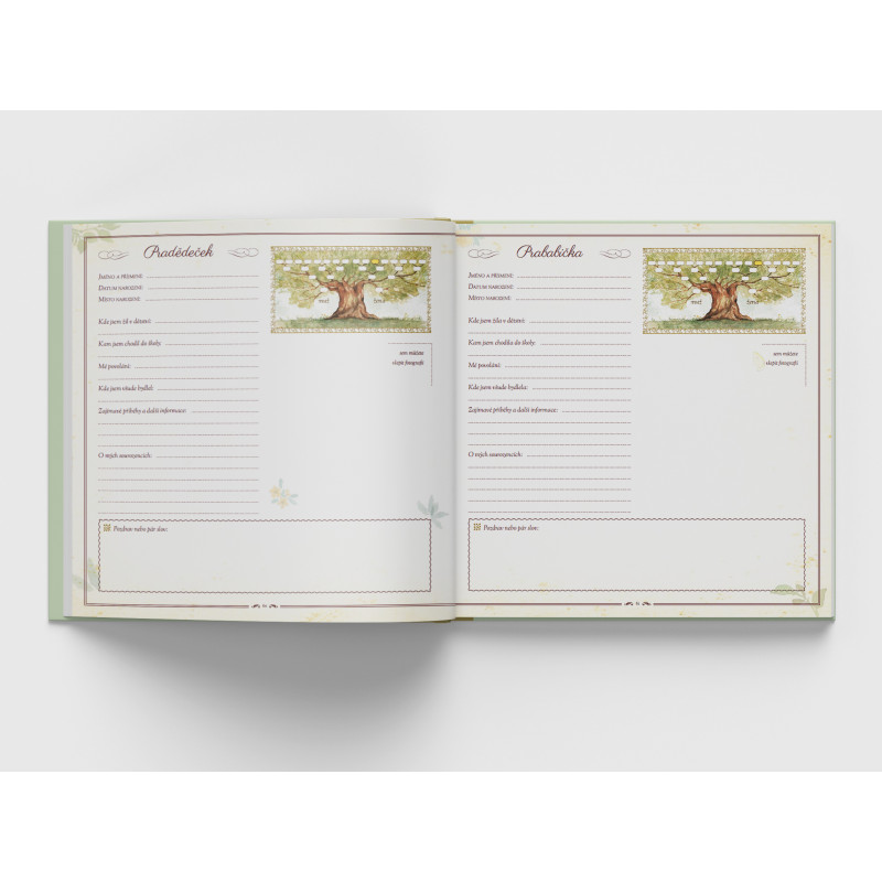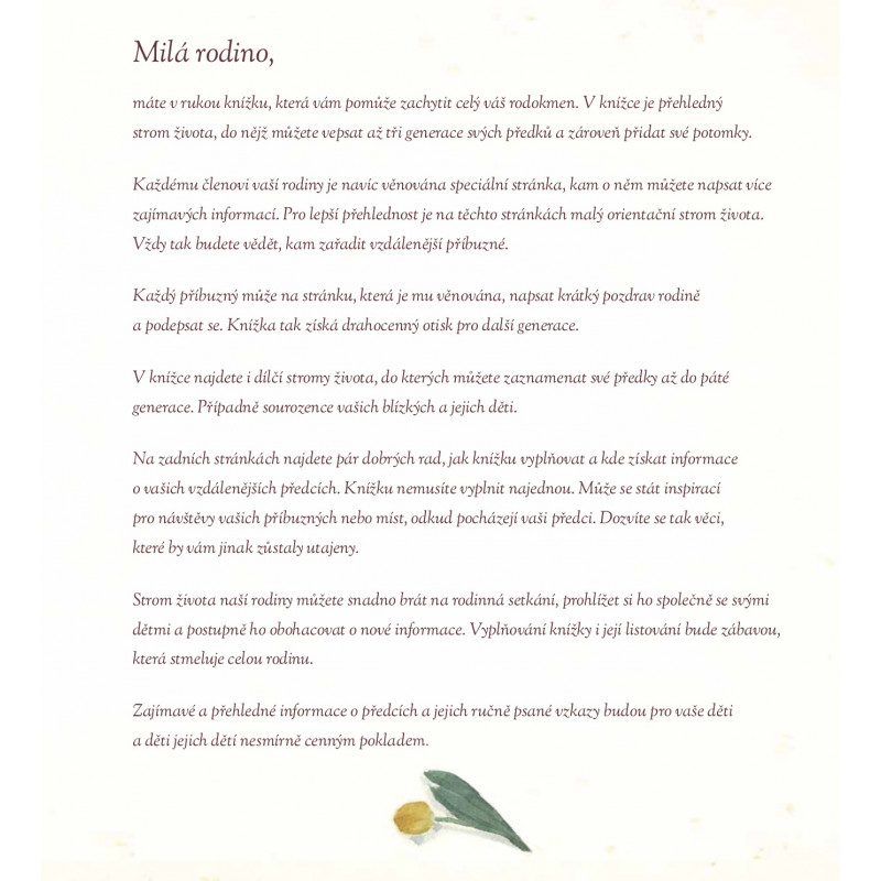 Strom života naší rodiny je originální knížka pro zaznamenání rodokmenu a rodinné historie. Knížka je velmi chytře propracovaná, takže do ní můžete pohodlně zanést své předky až do pátého kolene, ale zároveň i všechny své potomky. Ke každému členovi rodiny můžete přidat zajímavé informace o něm a jeho životě včetně fotografie. Zároveň můžete své příbuzné požádat, aby vám do knihy napsali vzkaz jako do památníku – pro vás a pro další generace.