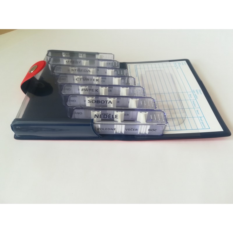 Součástí pouzdra je záznamový arch k přehlednému zapsání, které léky kdy vzít.