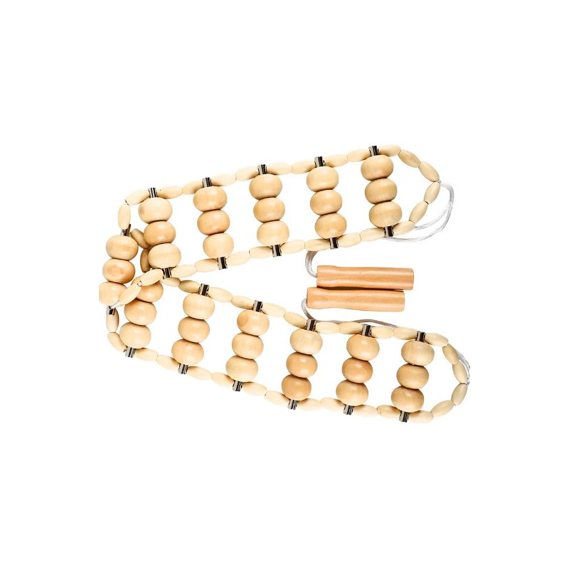 Dřevěný pás je vyroben ze dřeva, tedy přírodního materiálu, které je šetrné k pokožce celého těla a zdravotně nezávadné. Skládá se z jednotlivých masážních koleček umístěných po 3 na přírodním provazu, díky kterému se snadno otáčí a masírují tak každé místo na těle. Praktické dřevěné rukojeti zajistí spolehlivý úchop při masáži.